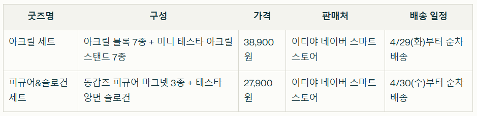 아크릴 세트와 피규어 & 슬로건 세트 등 한정판 굿즈는 2025년 4월 15일 오전 10시부터 이디야 공식 네이버 스마트스토어에서 판매가 시작되었으며, 오픈 직후 많은 팬들의 구매가 몰려 빠른 품절 추세를 보이고 있습니다. 실제로 아크릴 세트는 판매 시작 당일 초도 물량이 대부분 소진된 것으로 알려져, 추가 입고나 재판매 여부에 대한 문의가 많습니다.