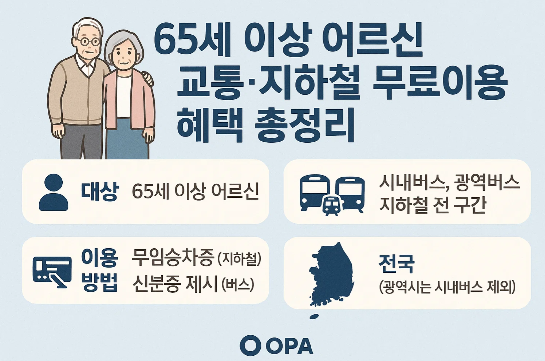 본 글은 만 65세 이상 어르신을 위한 교통 및 주요 복지 혜택에 대한 일반적인 정보 제공을 목적으로 작성되었습니다. 제시된 정보는 정책 변화, 지역별 차이 등으로 인해 실제와 다를 수 있으므로, 이용 전 반드시 관련 기관(주민센터, 교통 운영 기관, 보건복지부 등)을 통해 최신 정보를 직접 확인하시기 바랍니다. 본 글의 정보만을 근거로 한 결정에 대한 책임은 이용자 본인에게 있습니다.